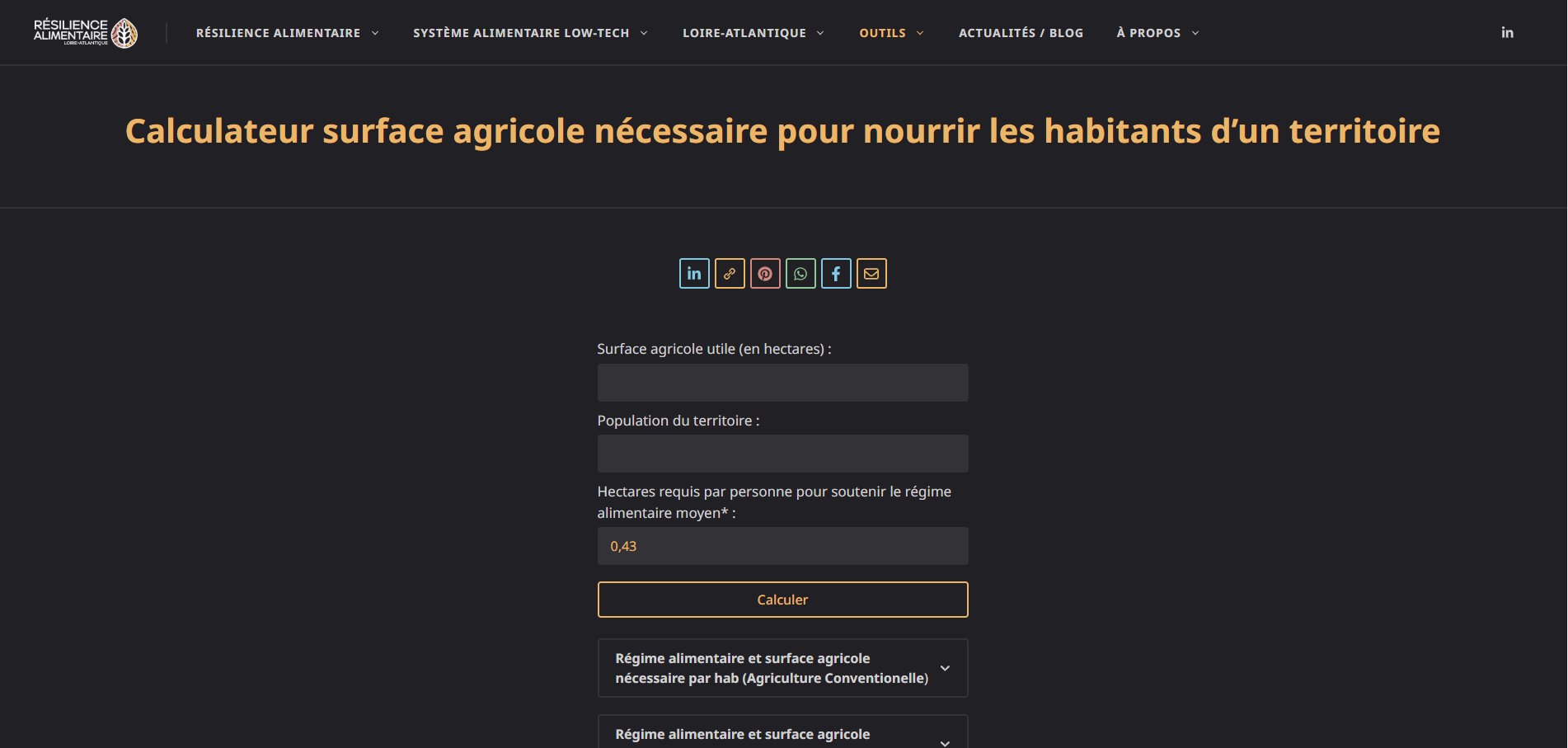 * Selon Carl Gaigné (2011), un Français a besoin en moyenne d’environ 0,18 hectare de culture et 0,12 hectare de prairie permanente pour se nourrir. Gaigné, C. (2011). 6 – Urbanisation et durabilité des systèmes alimentaires. Dans : Catherine Esnouf éd., Pour une alimentation durable: Réflexion stratégique duALIne (pp. 123-142).Versailles: Éditions Quæ. https://doi.org/10.3917/quae.esnou.2011.01.0123